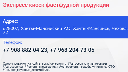 Экспресс, киоск фастфудной продукции по адресу 628007, Ханты-Мансийский АО, Ханты-Мансийск, Чехова, 72 в дальнейшем Организация, размещена в следующих категориях: