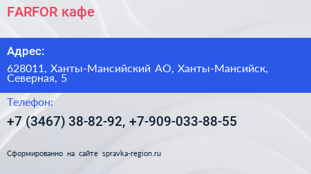 FARFOR, кафе по адресу 628011, Ханты-Мансийский АО, Ханты-Мансийск, Северная, 5 в дальнейшем Организация, размещена в следующих категориях: