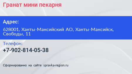 Гранат, мини-пекарня по адресу 628001, Ханты-Мансийский АО, Ханты-Мансийск, Свободы, 11 в дальнейшем Организация, размещена в следующих категориях: