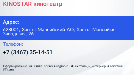 KINOSTAR, кинотеатр по адресу 628001, Ханты-Мансийский АО, Ханты-Мансийск, Заводская, 26 в дальнейшем Организация, размещена в следующих категориях: