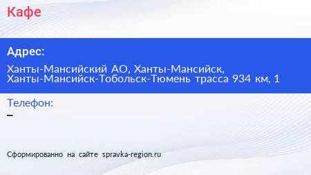 Кафе по адресу Ханты-Мансийский АО, Ханты-Мансийск, Ханты-Мансийск-Тобольск-Тюмень трасса 934 км, 1 в дальнейшем Организация, размещена в следующих категориях: