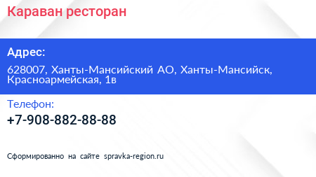 Караван, ресторан по адресу 628007, Ханты-Мансийский АО, Ханты-Мансийск, Красноармейская, 1в в дальнейшем Организация, размещена в следующих категориях: