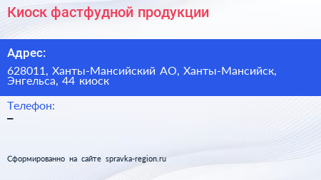 Киоск фастфудной продукции по адресу 628011, Ханты-Мансийский АО, Ханты-Мансийск, Энгельса, 44 киоск в дальнейшем Организация, размещена в следующих категориях: