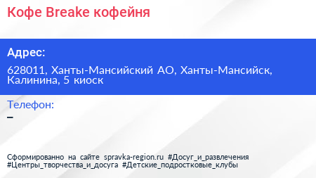 Кофе Breake, кофейня по адресу 628011, Ханты-Мансийский АО, Ханты-Мансийск, Калинина, 5 киоск в дальнейшем Организация, размещена в следующих категориях: