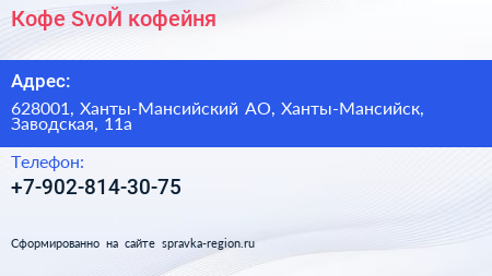Кофе SvoЙ, кофейня по адресу 628001, Ханты-Мансийский АО, Ханты-Мансийск, Заводская, 11а в дальнейшем Организация, размещена в следующих категориях: