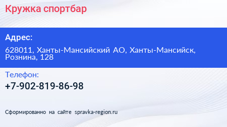 Кружка, спортбар по адресу 628011, Ханты-Мансийский АО, Ханты-Мансийск, Рознина, 128 в дальнейшем Организация, размещена в следующих категориях: