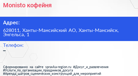 Monisto, кофейня по адресу 628011, Ханты-Мансийский АО, Ханты-Мансийск, Энгельса, 1 в дальнейшем Организация, размещена в следующих категориях:
