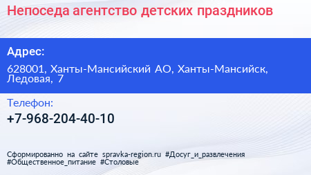 Непоседа, агентство детских праздников по адресу 628001, Ханты-Мансийский АО, Ханты-Мансийск, Ледовая, 7 в дальнейшем Организация, размещена в следующих категориях:
