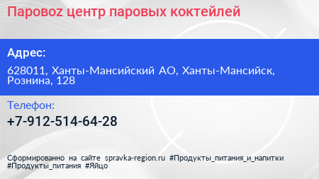 Паровоz, центр паровых коктейлей по адресу 628011, Ханты-Мансийский АО, Ханты-Мансийск, Рознина, 128 в дальнейшем Организация, размещена в следующих категориях: