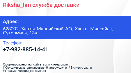 Riksha_hm, служба доставки по адресу 628002, Ханты-Мансийский АО, Ханты-Мансийск, Сутормина, 13а в дальнейшем Организация, размещена в следующих категориях: