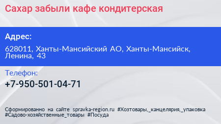 Сахар забыли, кафе-кондитерская по адресу 628011, Ханты-Мансийский АО, Ханты-Мансийск, Ленина, 43 в дальнейшем Организация, размещена в следующих категориях: