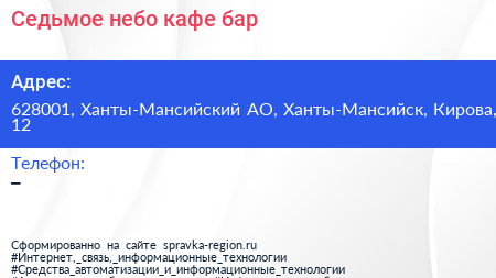 Седьмое небо, кафе-бар по адресу 628001, Ханты-Мансийский АО, Ханты-Мансийск, Кирова, 12 в дальнейшем Организация, размещена в следующих категориях: