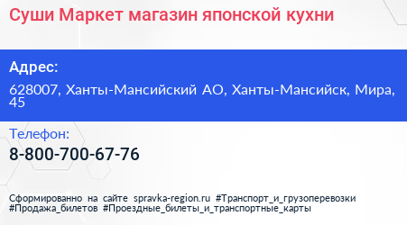 Суши-Маркет, магазин японской кухни по адресу 628007, Ханты-Мансийский АО, Ханты-Мансийск, Мира, 45 в дальнейшем Организация, размещена в следующих категориях: