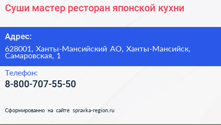 Суши мастер, ресторан японской кухни по адресу 628001, Ханты-Мансийский АО, Ханты-Мансийск, Самаровская, 1 в дальнейшем Организация, размещена в следующих категориях: