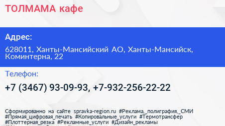 ТОЛМАМА, кафе по адресу 628011, Ханты-Мансийский АО, Ханты-Мансийск, Коминтерна, 22 в дальнейшем Организация, размещена в следующих категориях: