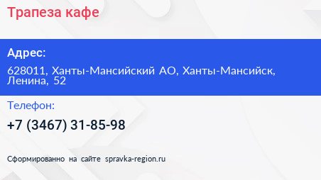 Трапеза, кафе по адресу 628011, Ханты-Мансийский АО, Ханты-Мансийск, Ленина, 52 в дальнейшем Организация, размещена в следующих категориях: