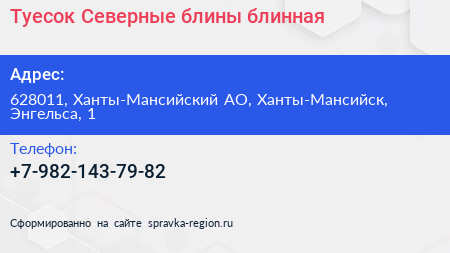 Туесок Северные блины, блинная по адресу 628011, Ханты-Мансийский АО, Ханты-Мансийск, Энгельса, 1 в дальнейшем Организация, размещена в следующих категориях: