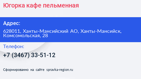 Югорка, кафе-пельменная по адресу 628011, Ханты-Мансийский АО, Ханты-Мансийск, Комсомольская, 28 в дальнейшем Организация, размещена в следующих категориях: