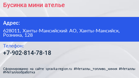 Бусинка, мини-ателье по адресу 628011, Ханты-Мансийский АО, Ханты-Мансийск, Рознина, 128 в дальнейшем Организация, размещена в следующих категориях:
