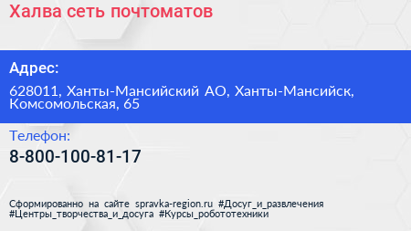 Халва, сеть почтоматов по адресу 628011, Ханты-Мансийский АО, Ханты-Мансийск, Комсомольская, 65 в дальнейшем Организация, размещена в следующих категориях: