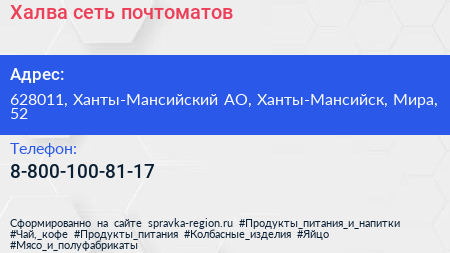 Халва, сеть почтоматов по адресу 628011, Ханты-Мансийский АО, Ханты-Мансийск, Мира, 52 в дальнейшем Организация, размещена в следующих категориях: