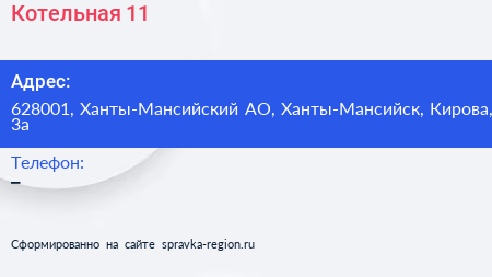 Котельная №11 по адресу 628001, Ханты-Мансийский АО, Ханты-Мансийск, Кирова, 3а в дальнейшем Организация, размещена в следующих категориях: