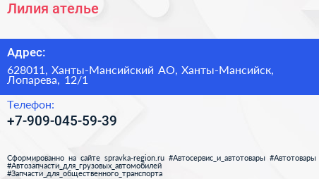 Лилия, ателье по адресу 628011, Ханты-Мансийский АО, Ханты-Мансийск, Лопарева, 12/1 в дальнейшем Организация, размещена в следующих категориях: