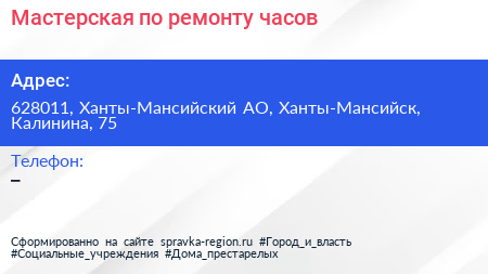 Мастерская по ремонту часов по адресу 628011, Ханты-Мансийский АО, Ханты-Мансийск, Калинина, 75 в дальнейшем Организация, размещена в следующих категориях: