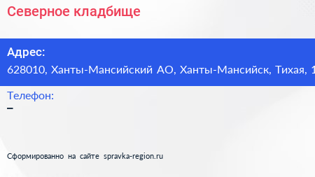 Северное кладбище по адресу 628010, Ханты-Мансийский АО, Ханты-Мансийск, Тихая, 1 в дальнейшем Организация, размещена в следующих категориях:
