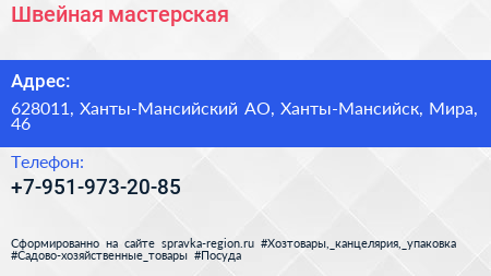 Швейная мастерская по адресу 628011, Ханты-Мансийский АО, Ханты-Мансийск, Мира, 46 в дальнейшем Организация, размещена в следующих категориях:
