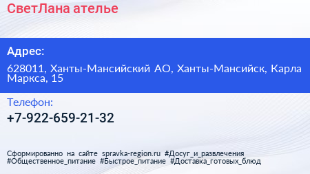 СветЛана, ателье по адресу 628011, Ханты-Мансийский АО, Ханты-Мансийск, Карла Маркса, 15 в дальнейшем Организация, размещена в следующих категориях: