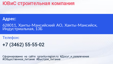 ЮВиС, строительная компания по адресу 628011, Ханты-Мансийский АО, Ханты-Мансийск, Индустриальная, 13Б в дальнейшем Организация, размещена в следующих категориях: