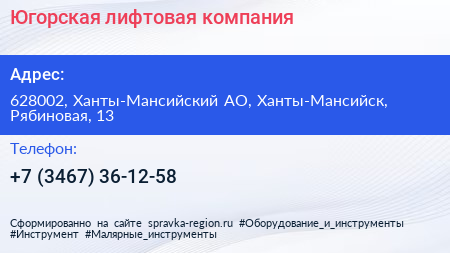 Югорская лифтовая компания по адресу 628002, Ханты-Мансийский АО, Ханты-Мансийск, Рябиновая, 13 в дальнейшем Организация, размещена в следующих категориях: