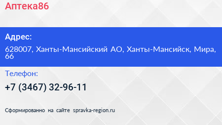 Аптека86 по адресу 628007, Ханты-Мансийский АО, Ханты-Мансийск, Мира, 66 в дальнейшем Организация, размещена в следующих категориях: