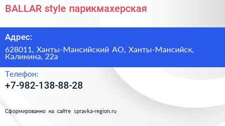 BALLAR style, парикмахерская по адресу 628011, Ханты-Мансийский АО, Ханты-Мансийск, Калинина, 22а в дальнейшем Организация, размещена в следующих категориях: