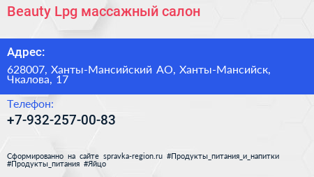 Beauty Lpg, массажный салон по адресу 628007, Ханты-Мансийский АО, Ханты-Мансийск, Чкалова, 17 в дальнейшем Организация, размещена в следующих категориях: