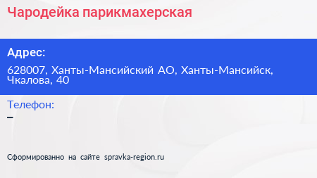 Чародейка, парикмахерская по адресу 628007, Ханты-Мансийский АО, Ханты-Мансийск, Чкалова, 40 в дальнейшем Организация, размещена в следующих категориях:
