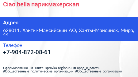 Ciao bella, парикмахерская по адресу 628011, Ханты-Мансийский АО, Ханты-Мансийск, Мира, 44 в дальнейшем Организация, размещена в следующих категориях: