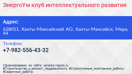 ЭнергоУм, клуб интеллектуального развития по адресу 628011, Ханты-Мансийский АО, Ханты-Мансийск, Мира, 44 в дальнейшем Организация, размещена в следующих категориях: