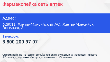 Фармакопейка, сеть аптек по адресу 628011, Ханты-Мансийский АО, Ханты-Мансийск, Энгельса, 3 в дальнейшем Организация, размещена в следующих категориях:
