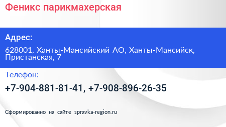 Феникс, парикмахерская по адресу 628001, Ханты-Мансийский АО, Ханты-Мансийск, Пристанская, 7 в дальнейшем Организация, размещена в следующих категориях: