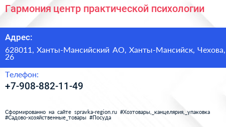 Гармония, центр практической психологии по адресу 628011, Ханты-Мансийский АО, Ханты-Мансийск, Чехова, 26 в дальнейшем Организация, размещена в следующих категориях: