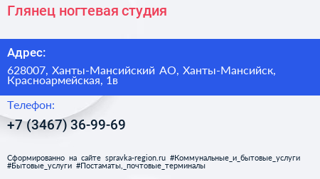 Глянец, ногтевая студия по адресу 628007, Ханты-Мансийский АО, Ханты-Мансийск, Красноармейская, 1в в дальнейшем Организация, размещена в следующих категориях: