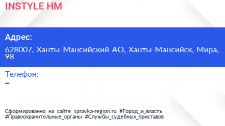 INSTYLE.HM по адресу 628007, Ханты-Мансийский АО, Ханты-Мансийск, Мира, 98 в дальнейшем Организация, размещена в следующих категориях: