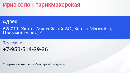Ирис, салон-парикмахерская по адресу 628011, Ханты-Мансийский АО, Ханты-Мансийск, Промышленная, 7 в дальнейшем Организация, размещена в следующих категориях: