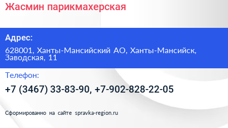 Жасмин, парикмахерская по адресу 628001, Ханты-Мансийский АО, Ханты-Мансийск, Заводская, 11 в дальнейшем Организация, размещена в следующих категориях: