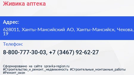 Живика, аптека по адресу 628011, Ханты-Мансийский АО, Ханты-Мансийск, Чехова, 19 в дальнейшем Организация, размещена в следующих категориях: