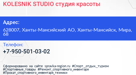 KOLESNIK STUDIO, студия красоты по адресу 628007, Ханты-Мансийский АО, Ханты-Мансийск, Мира, 68 в дальнейшем Организация, размещена в следующих категориях: