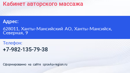 Кабинет авторского массажа по адресу 628011, Ханты-Мансийский АО, Ханты-Мансийск, Северная, 9 в дальнейшем Организация, размещена в следующих категориях: