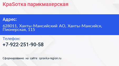 КраSотка, парикмахерская по адресу 628011, Ханты-Мансийский АО, Ханты-Мансийск, Пионерская, 115 в дальнейшем Организация, размещена в следующих категориях: